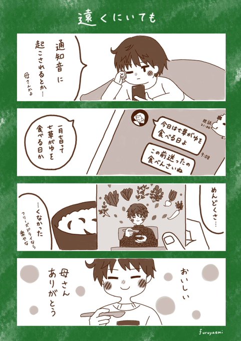 【3ヶ月上達法振り返り漫画】8/12 8巡目イラスト▼ twitter.com/fullfull314/st… 七草粥の日にちなんで描いたイラスト。気軽に楽しく自炊をしようという気持ちを込めて描きました。実家を出ると親の有難みが身に染みますね。 #3ヶ月上達法 #振り返り漫画 #4コマ漫画 #漫画が読めるハッシュタグ