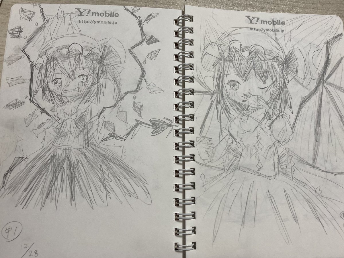 まあビックリしましたよ。 久々に自由帳を開けたら約1年半前のイラストが出てきたんですから。 #落描き #フランドール・スカーレット #レミリア・スカーレット
