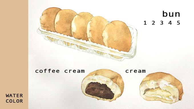 2 5 だいぶ前に描いた水彩紙の試し描き。 ウォーターフォード紙(ナチュラル)中目。 ベースが暖かみのある色なので 優しく懐かしい雰囲気に仕上がりました。 アレンジはおまけで…。 かわいいサイズのクリームパン。 並んでる姿が好みです。 フワコロでおいしいですよ。 #イラスト #水彩画 #パン 21/04/04 02:24