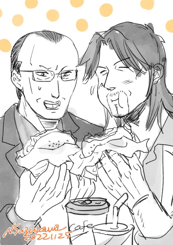 2 7 #今月描いた絵を晒そう ほぼほぼえざうしらくがき 他人からみたらロン毛の髭面とM字ハゲメガネというキッツイ絵面でも、関係性に萌えちゃったんだからしゃーない😹 22/10/29 16:34