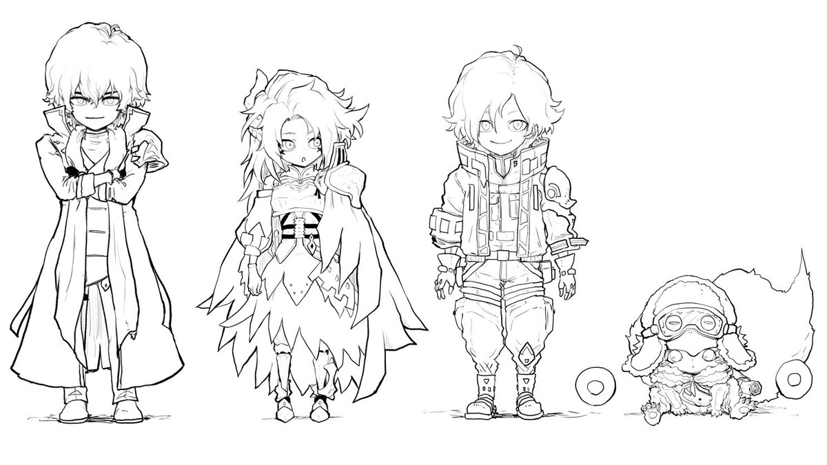 「ポルカ、リズ、リアム、アーニャ」 見かけたチラシに載ってるキャラたち🫠 一章と二章の代表主人公なのか、あえての一章一部からのみなのかは知る由もありませんが、とりあえず二章の方々の服装だけ初期ではなく最終イメージです 始まりと今!いや趣味です🐸 #ロマサガRS前夜祭 #サガ絵