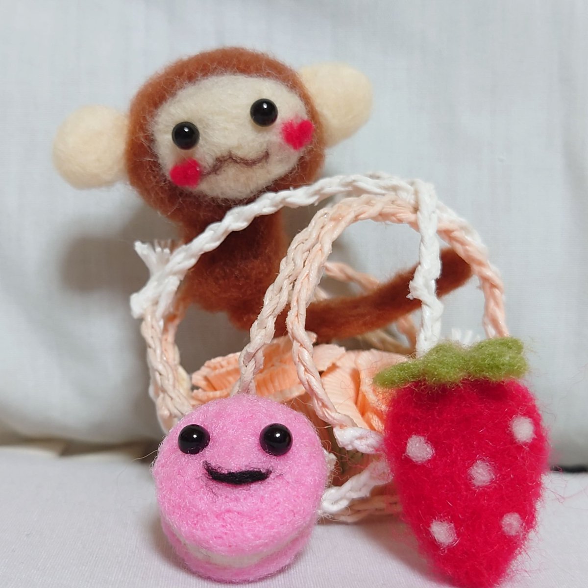 ニードルフェルトで、いちご、マカロン、サル作りました😀マカロンに顔付けてみました。サルは、ハートのほっぺにしてみました🐵❤️🍓 #ニードルフェルト #羊毛フェルト #羊毛フェルトさる #羊毛フェルトいちご #羊毛フェルトマカロン