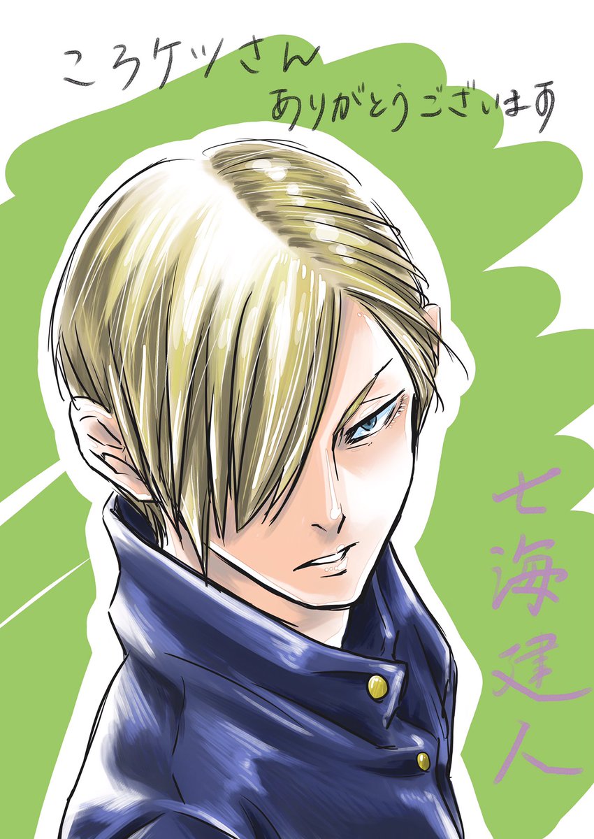 3 22 #フォロワーさんの推しが描きたい ころケツさん(@korokke_illust )から 七海建人。 高専時代描いたことなかったので意気込んだのですが、このナナミン呪詛師まっしぐらな顔つきですね。 21/02/24 23:55