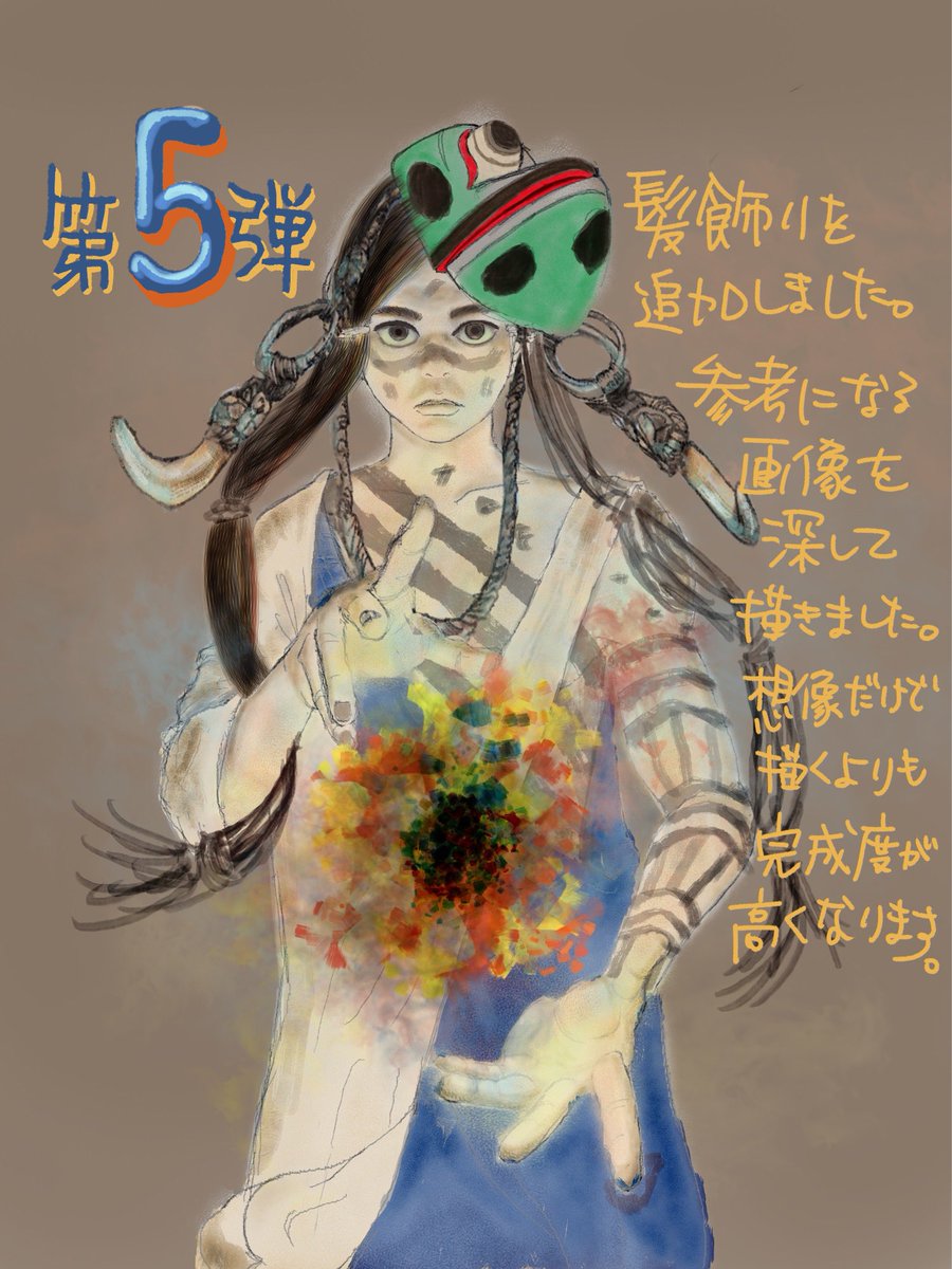 第5弾! 髪飾りを追加。 実際にどこかの民族が付けている髪飾りを参考にしました。 小物がひとつ増えるだけで世界観の演出になりますね。 #イラスト #イラストグラム #イラストレーター #イラスト好きな人と繋がりたい #オリジナルイラスト #デジタルイラスト #絵 #絵描きさんと繋がりたい #絵描き
