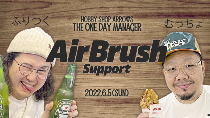 6/5(日)開催のhobby shop Arrows一日店長の詳細決定! ふりつく&むっちょのAirBrush support と題して水性塗料を使ったエアブラシ体験会を開催します! 更に14時から大人気模型サイトnippper副編集長フミテシ氏をゲストにお招きして水性エアブラシハウトゥ記事の公開撮影を予定!皆の参加待ってるぜ!