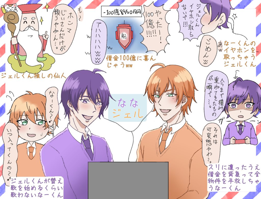 ちょっと描くの遅すぎたけど昨日のななジェル枠好きなところ詰めれた🥰 セリフはうろ覚えですが特に好きだったシーン達です💜🧡 #すとぷり24時間リレー生放送 #すとぷりギャラリー #ななジェル #ジェルくん #なーくん