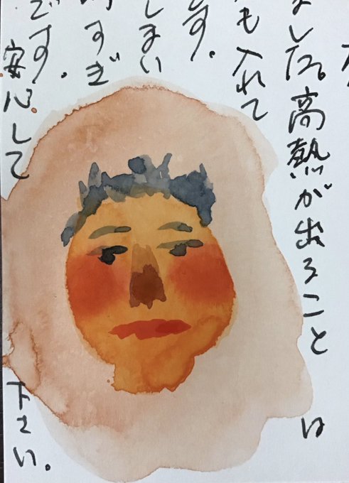 毎日ハガキを書いて両親に贈る古風なことをしてます.時々忘れますが今日も書けました.しょうもないことです. #一日一通 熱っぽかった日の自画像. #水彩画