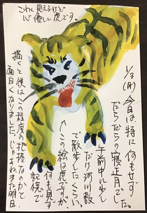 0 17 毎日ハガキを書いて両親に贈る古風なことをしてます.時々忘れますが今日も書きました. #一日一通 虎ってどんなだっけ? #水彩画 22/01/03 21:10
