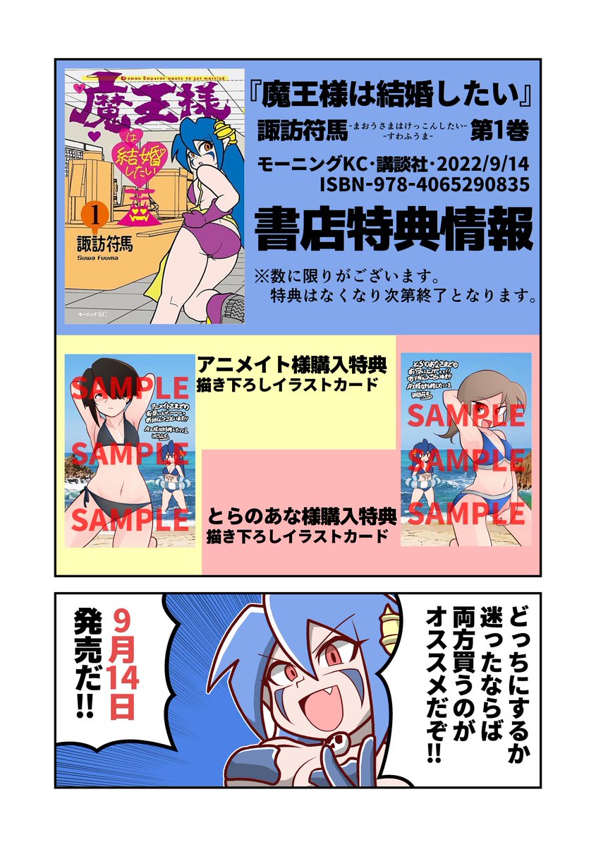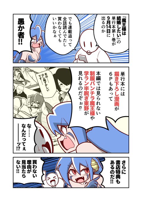 魔王様は結婚したい 第1巻が9/14に発売されます! 読者サービス意識強めのオマケ漫画も充実してたりするし、なにより買ってくれると連載が継続されるという作者が嬉しい特典付き Amazonとかではもう予約できるみたいです! #魔王様は結婚したい #まおけつ amzn.asia/d/cx8NiyT