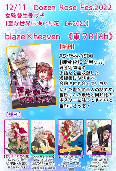12月11日(東京)Dozen Rose Fes.2022 歪な世界に咲いた花 DR2022のスペース頂けました! 【東7ホール R16b:blaze×heaven】 当日はジャク監♀新刊出ます!新刊サンプルは引RTに繋げておりますので、良ければ見てやって下さい☺️ 情勢次第な所はありますが今の所参加予定ですのでよろしくお願いします🙏 twitter.com/fuwa2jack/stat…