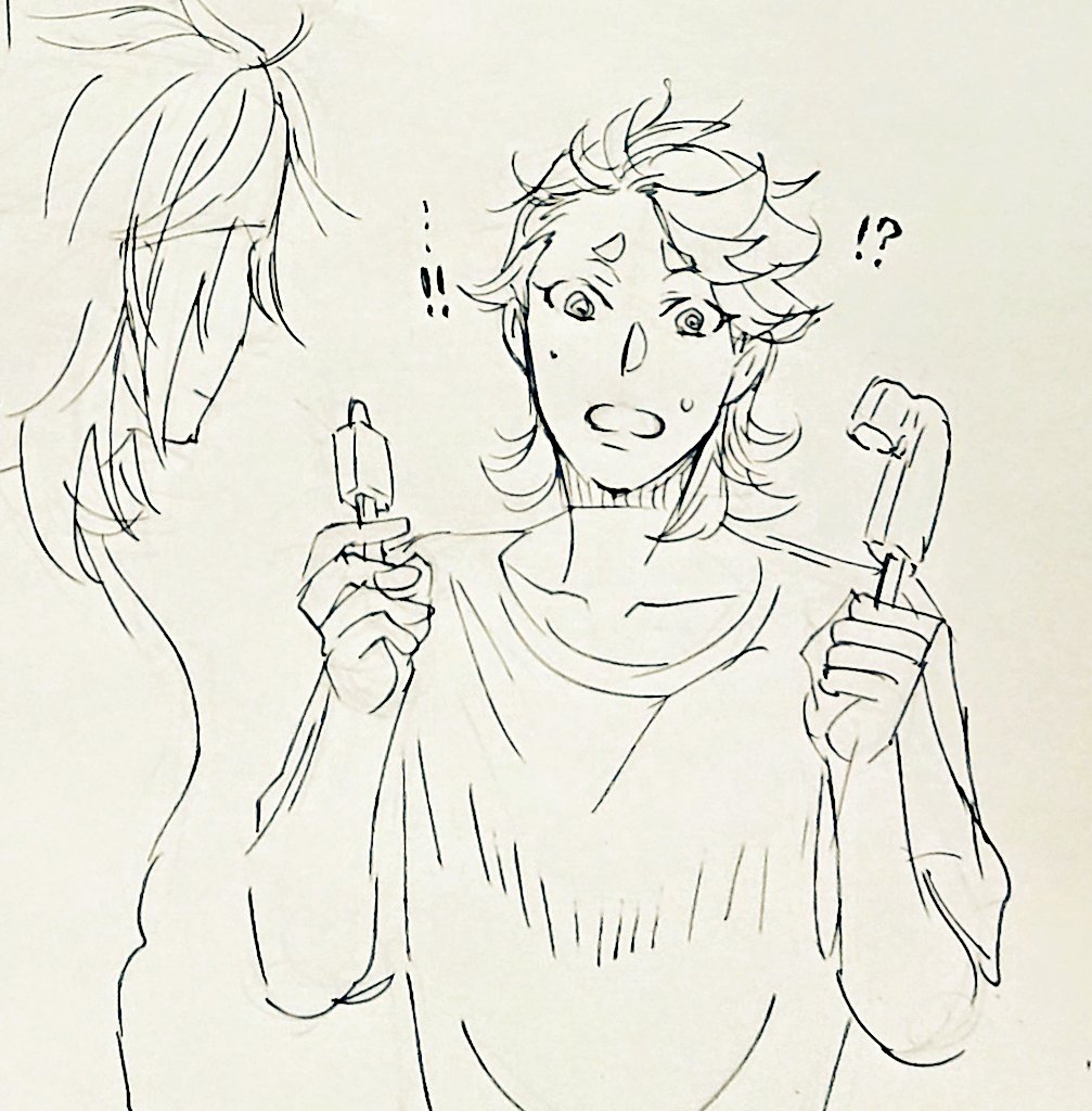 三池落書き ミイケチャン🧊アイスを食べる 二つに割るやつ半分こにできなかった…!兄弟どうしよう!?