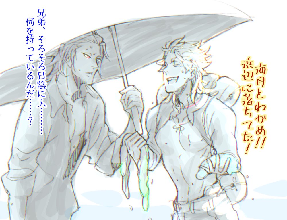 三池落書き 満喫中の顕現兄弟🏖️🐚🌈🌞😆😆😆 「🌊がな、違うんだよな!明るくて透き通ってて鮮やかで✨」 「そうか…(兄弟の事だな…)」 「あっちの岩影、ちっちぇー🐟️が泳いでた!可愛いな!」 「そうだな…(兄弟がな…)」 外の光が強すぎて、そろそろバグってきたヨさん
