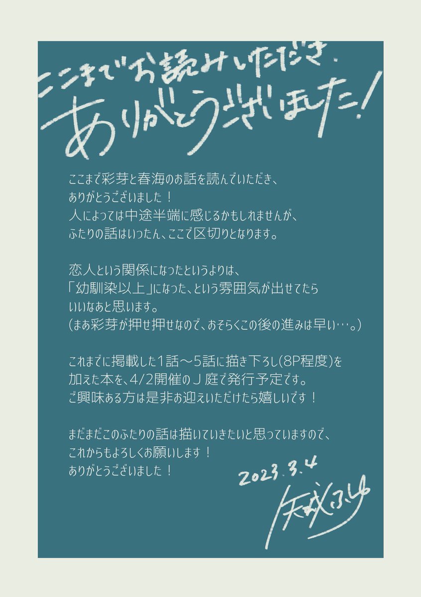 4 146 ずっと一緒に居た幼馴染とこれからも一緒に居ると決めた話(3/4) 「いろどりたる春の君と」第5話(最終話) #創作BL #漫画が読めるハッシュタグ #あやはる_bl 23/03/04 21:05