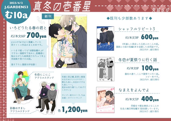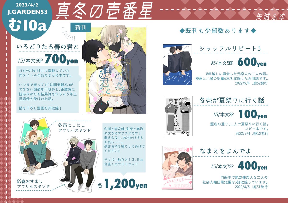 🌸4/2 J庭53 お品書き🌸 ■む10a■ 「真冬の壱番星」 にてお待ちしております! ここに記載のもののほか、 ・無配ペーパー ・名刺 も置いてあるはずなので、お気軽に遊びに来てください💃✨ #創作BL #J庭53 #お品書き