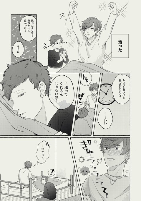 0 1 4/18の冬樹誕生日漫画の続き描きました☺️👍 元気になったイチくんと、ご褒美おねだりする冬樹の3p漫画です。いつもよりイチャ度高めな2人を描けて死ぬほど楽しかった……🕺 #創作BL #冬壱 23/04/22 20:12
