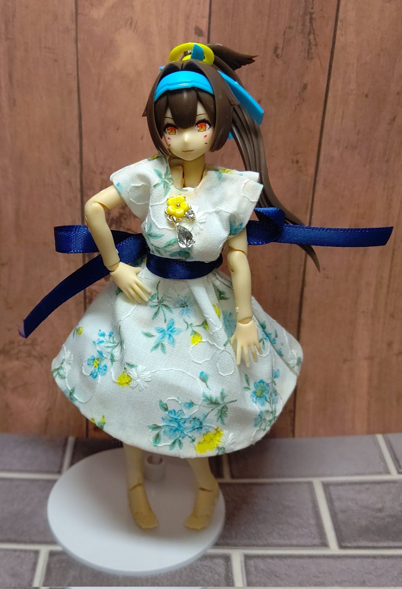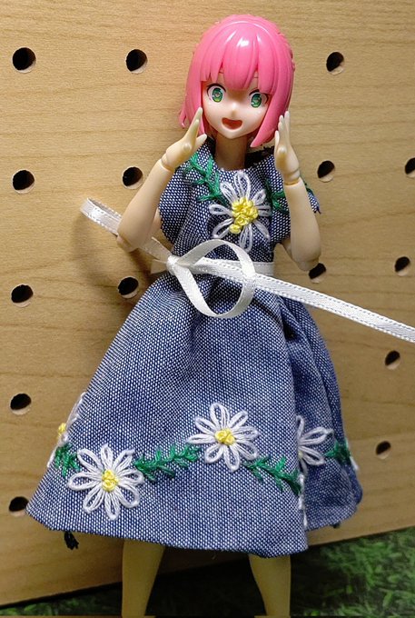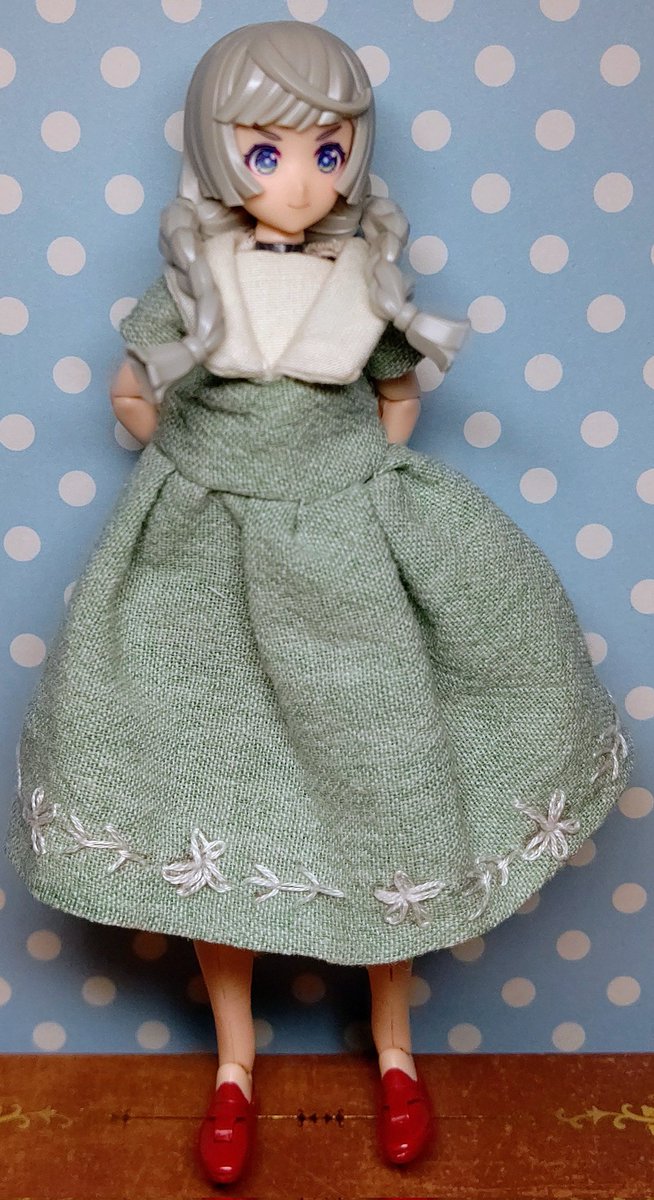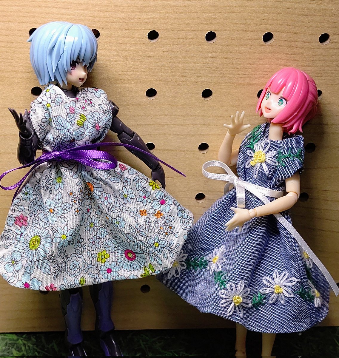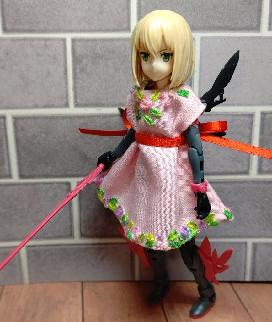 布服、もう一着出来ました♪ 刺繍をしてあります。 ピコニーモmの素体のランサーちゃんには膝下くらいです。 フレズちゃんとランサーちゃんの服の型紙同じなんです。 刺繍と花柄プリント印象ちょっと代わりますよね😆 #フレームアームズ・ガール #メガミデバイス #布服