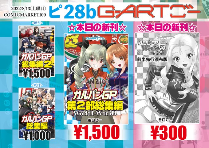 お品書きです! 既刊ガルパンGP総集編GP0-GP4 ¥1,000 再販しました 新刊総集編2GP5-GP8 ¥1,500 まとめ本 新刊GPWorld1-開幕- ¥500 完全新作 全部買うと¥3,000、シリーズ全話読めます! サークルG-ARTごー土曜日南地区サ09a お待ちしております! #ガルパンGP #C97WebCatalog webcatalog-free.circle.ms/Circle/14811941