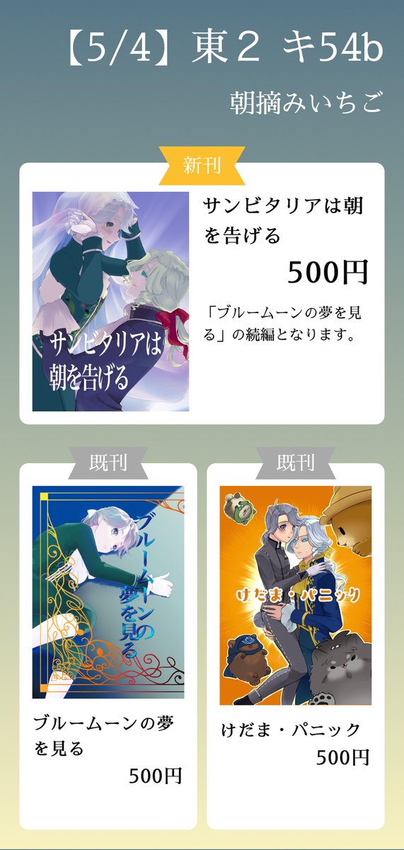 5月4日 超残狂ハルシネイト 東2 キ54b 朝摘みいちご 初の東京参加に怯えながら参戦します! サンプル少しですがpixivにございます 5/4 おしながき | めむたろう #pixiv pixiv.net/artworks/97959… よろしくお願いします! #写納プチオンリー #写し残されしは黄色の薔薇