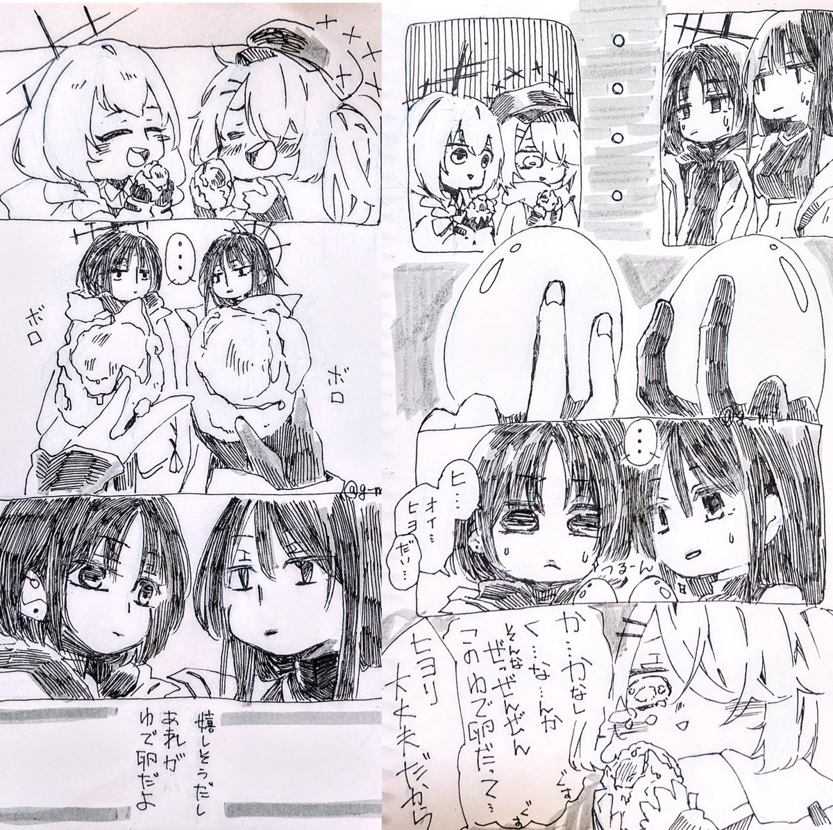 14 24 【rkgk:ブルアカ】 💚「つるつる…」 💛「食べないの…?」 💚「いただきますぅ!!!!」 (定期的にゆで卵の皮むき練習してるヒヨリとそれに付き合うミサキはいます!) (交換する必要ないのにヒヨリの剥いたゆで卵食べるミサキは絶対に存在する!) 23/02/27 12:58
