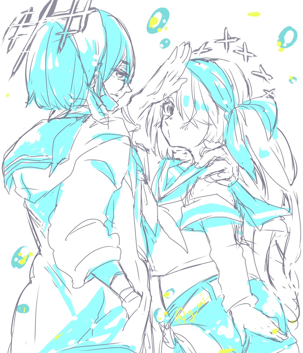 12 19 【ブルアカ:rkgk】 💚「あっぷっぷぅーー」 💛「………………………………。」 (付き合ってくれるミサキ。でも、しっかりとはしないし正面も見ないミサキさん) 23/05/15 12:43