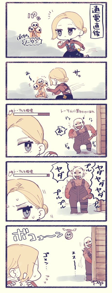 ちょっと前に会ったいじけトラッパーかわいかった日記 殴れば全然ワンパンできる距離だったのに、こっち見てプルプルしてた☺️ しばらく物陰から出てこなくて、様子見に行ったら普通にチェイス始まりました笑 #DeadbyDaylight #DbDfanart #DbDアート