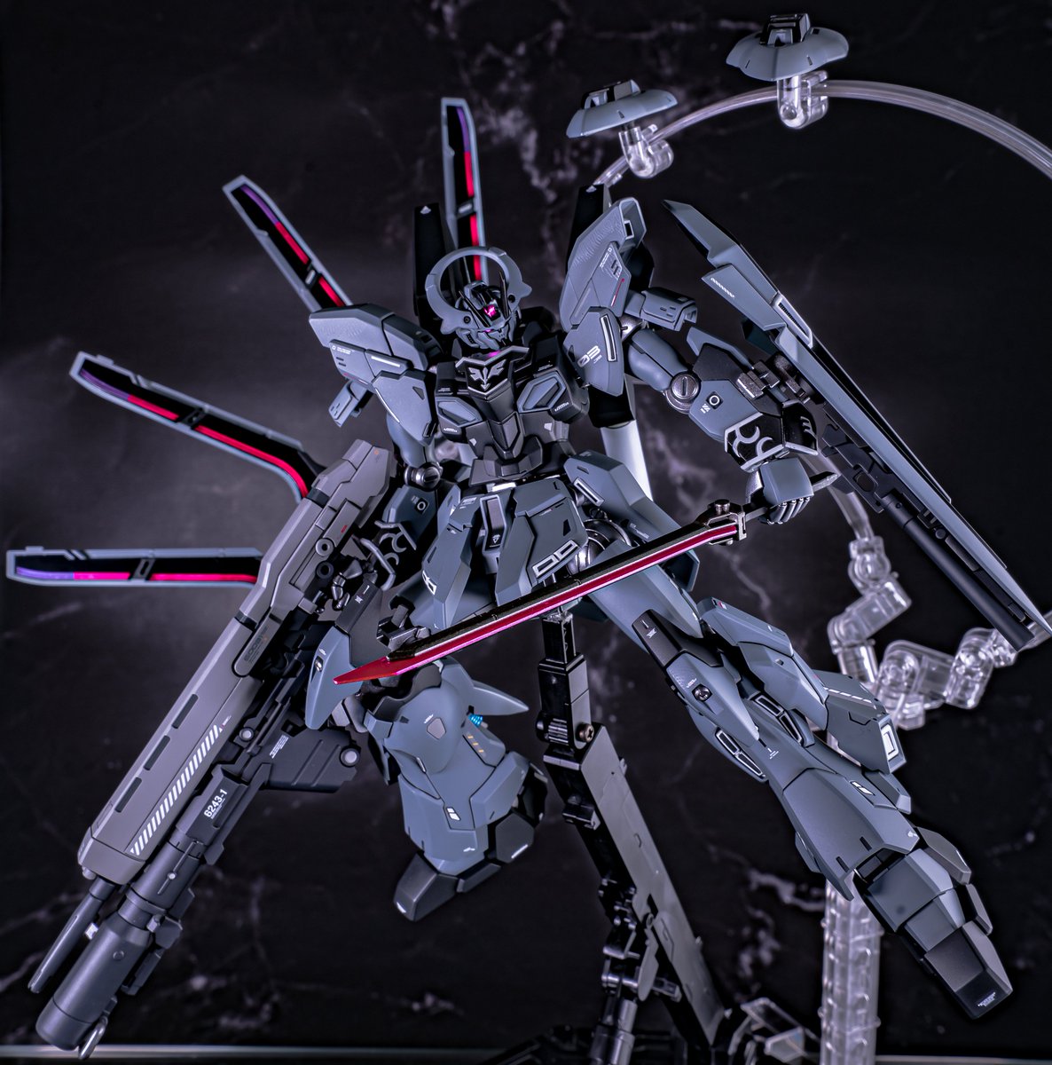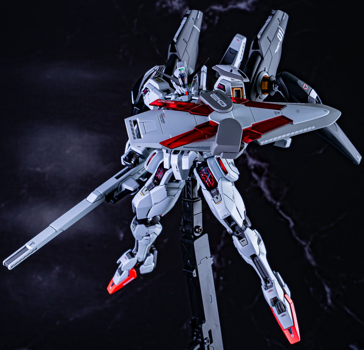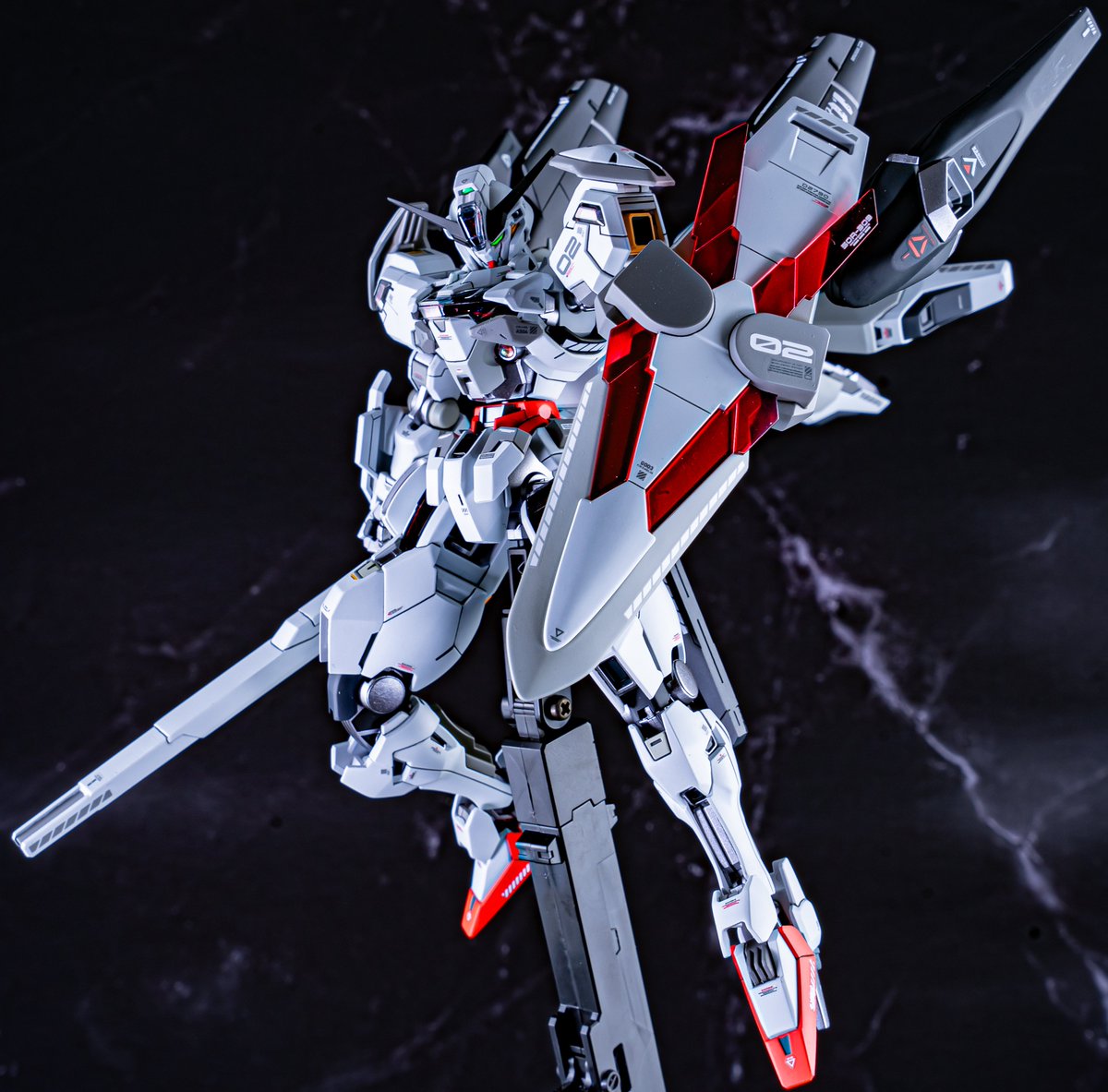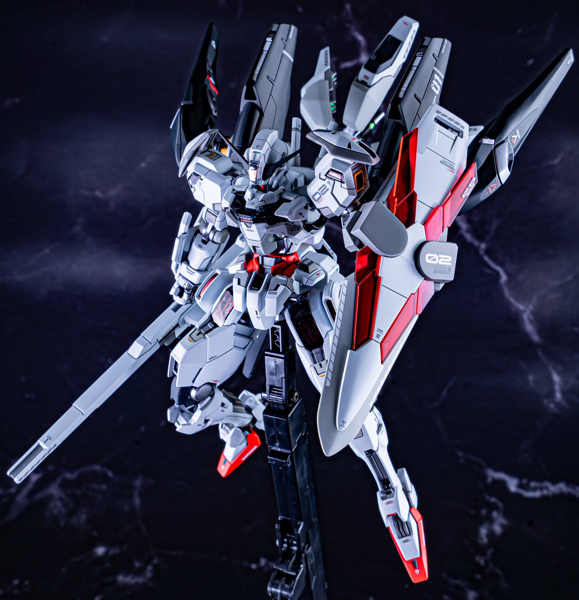 ガンダムキャリバーン完成です。 赤パーメットでも作っておきたかったので・・ バーニアの大型化とファラクトの武装を搭載しておきました。 キャリバーンは2回目なので02号機のデカールを貼りつけています。