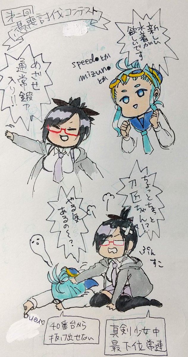 憑喪討伐コンテストお疲れ様でした~!この一週間で戦闘用およぎちゃんが3人になりました( ^ω^) #しんけんイラスト #しんけん魁イラスト
