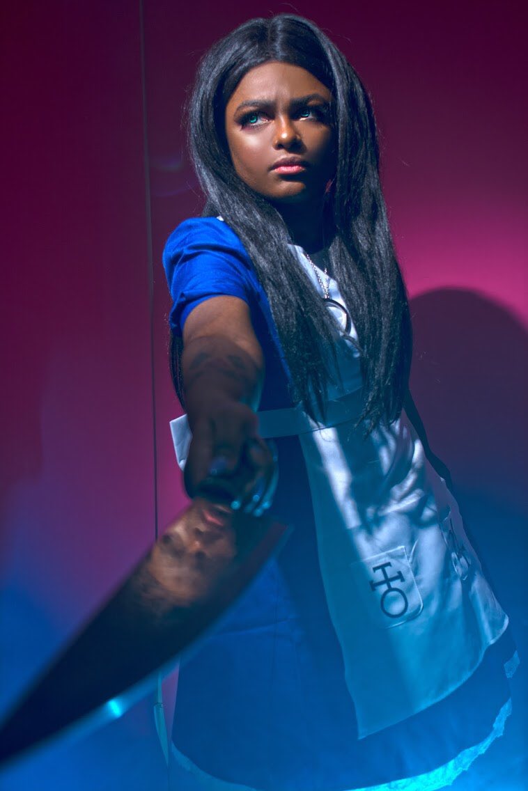 “You've used me and abused me, but you will not destroy me!”@AbiiCandii has done it again!😭💙look how awesome she made me look.💙💙🔪🔪 I love taking photos with her, please go love her stuff!! 🥰💙👋🏾💙💙👋🏾🔪🦋🦋 #cosplay #americanmcgeesalice #alicemadnessreturnscosplay