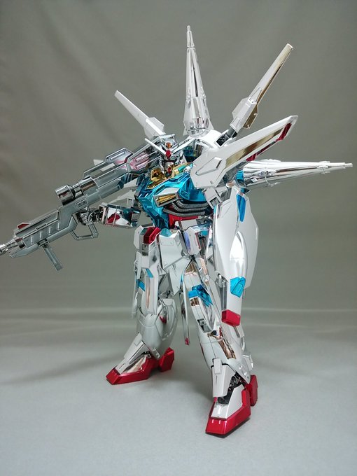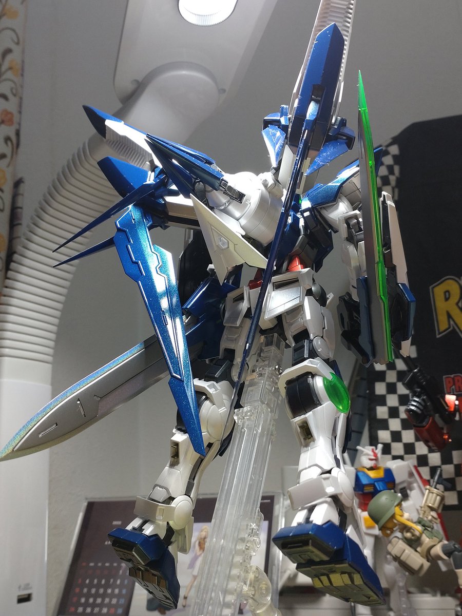 #今月作ったプラモ晒そうぜ 漸く完成です♪ 1/100MG アメイジング・エクシア &アクションベース ソレスタル・ビーイング 4年前にエクシア・ダークマターを作ってから、いつかは並べてみたいと思い続け…やって良かった(*´`) いつもの如く、表面処理とエッジ出しに専念してパール系塗装してます✨