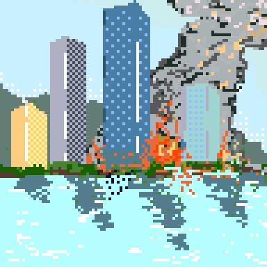 なんとなくで湾岸都市部の爆発?火災?をドットで打ってみた。写真とか参考にすればよかったかな。 #ドット絵