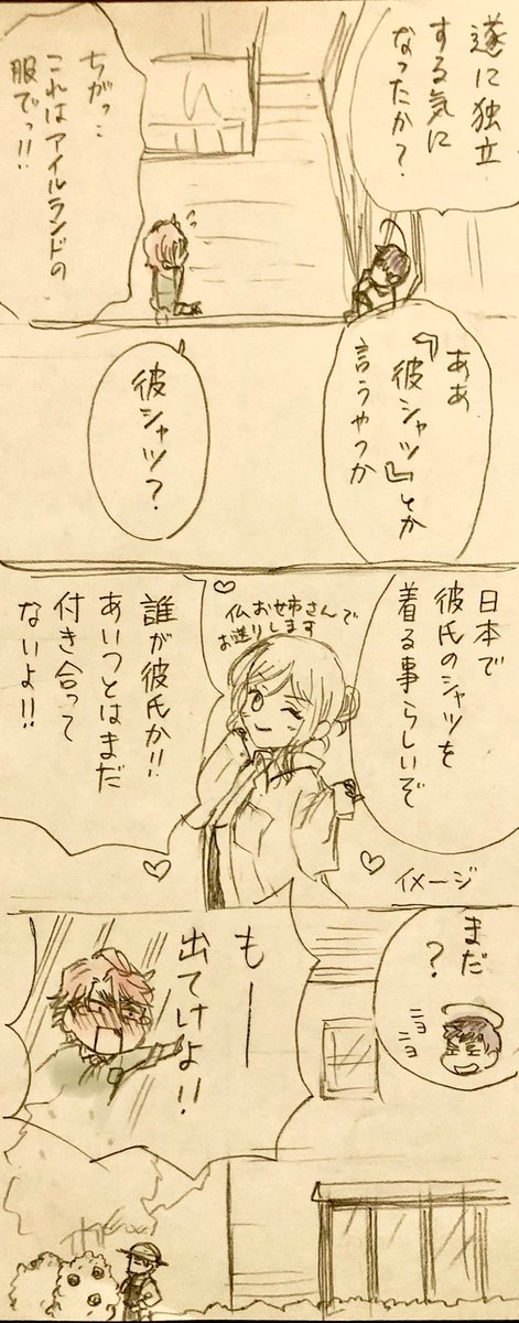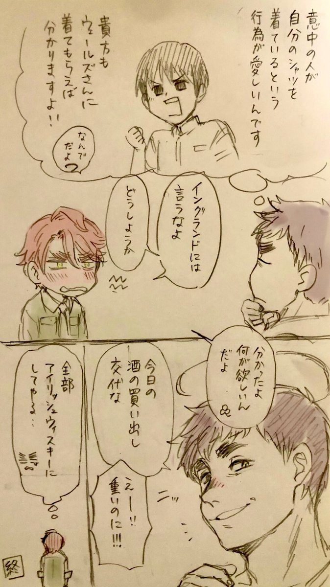 注意 ※腐要素あり(アイルのん) 昔1枚目から3枚目迄を描いたときに、これ続きの後日談あるんですよって言ってから多分半年以上経ちました やっと続きを描きました 全四ページ 全てのページの色味が違うのはお許し頂きたい twitter.com/gamute119/stat…