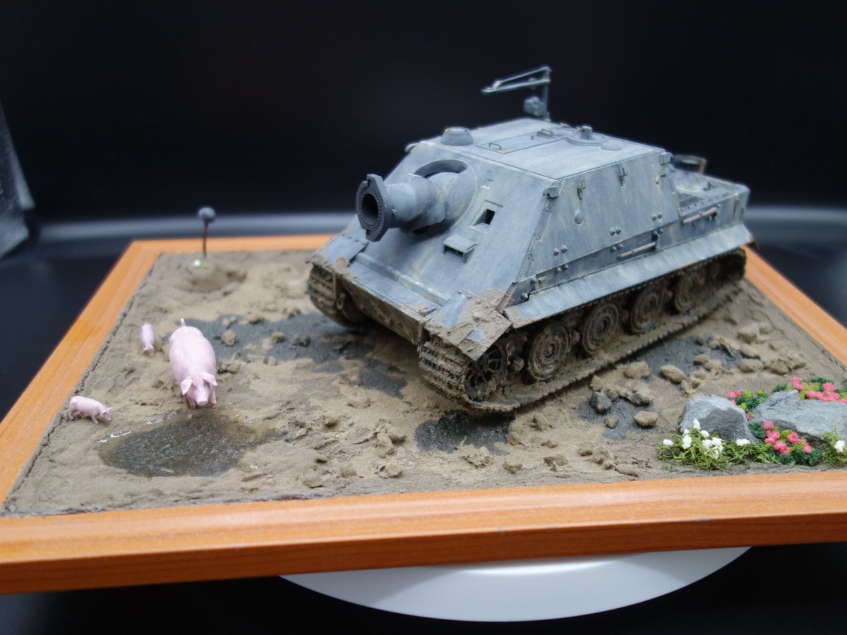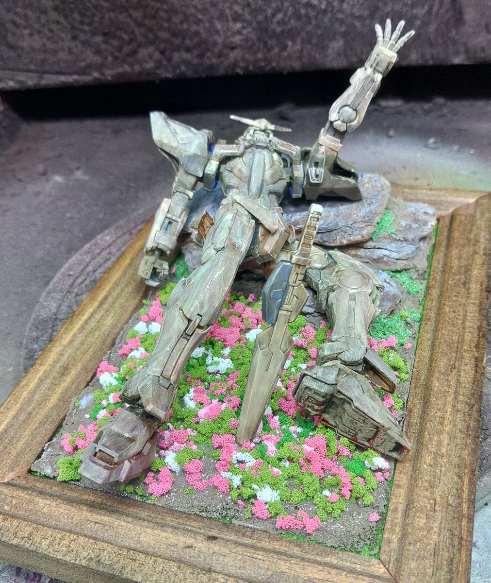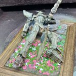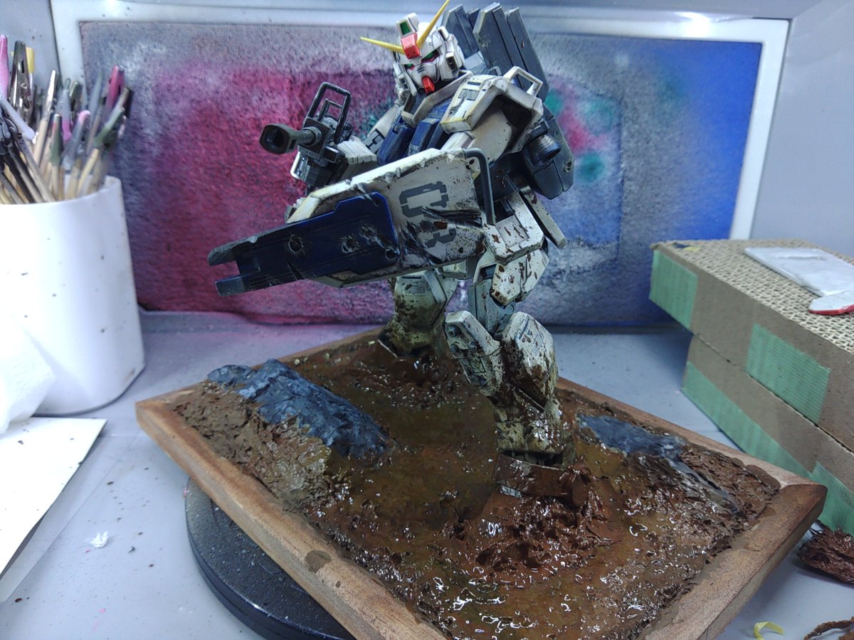 ちょっと泥汚れやりすぎた感があるけど、取りあえずこれにて完成 もう少し泥の跳ね上がりをかっこよくしたいけど、初作品ということで妥協します(´□` ) 外枠ヤスってニス塗り直して、タイトルのプレート作ろう(・∀・) #ガンプラは自由だ #ジオラマ #ガンプラの画像貼るとRTされると聞いて
