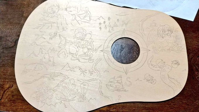 昨日の配信で焼き付け作品! 5人での合作イラストをウクレレの木の板に焼き付け! イメージは宝の地図です(o^-')b ! どのキャラも凄く個性が出ていて焼き付けしていて楽しすぎました! ❌印の所にはどんな宝が!? #ウッドバーニング #Pyrography #イラスト #ウクレレ twitter.com/gannbattehor…