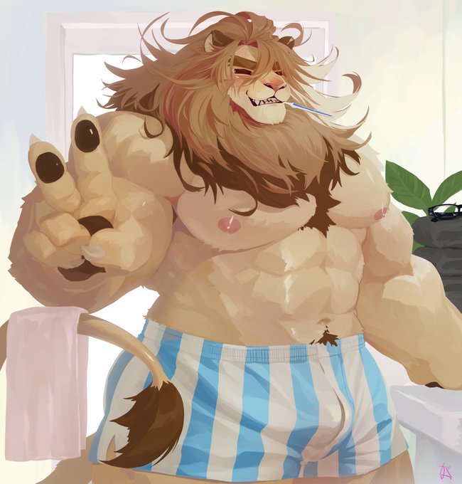 朝の支度中でもじゃもじゃだけどカメラ向けるとピースしてくれるライオン獣人です。 It is a lion beast man preparing for the morning.