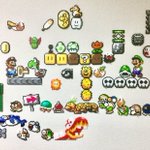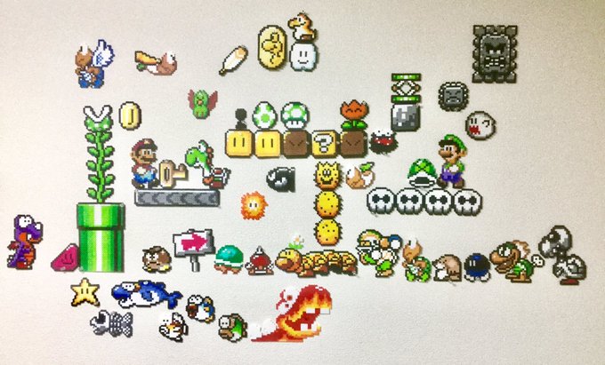 マリオだいぶ増えたので 壁に貼ってみました。 #アイロンビーズ #パーラービーズ #スーパーマリオワールド #pixelart #parlerbeads