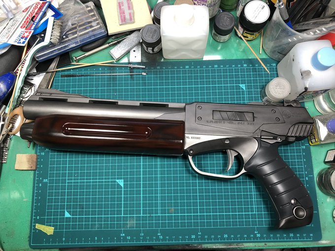 34 152 ハイ、つー事でONE DAYペイントでアーマーマグナム仕上げてみました 装甲騎兵祭にて展示予定です 木目調塗装は適当ですが、本体はサフってからワイヤーブラシでガシガシ擦って使用感とヘアラインぽく仕上げて メタルカラーのダークアイアンを塗装してます #装甲騎兵祭 22/01/29 20:59