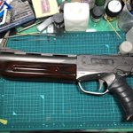 ハイ、つー事でONE DAYペイントでアーマーマグナム仕上げてみました 装甲騎兵祭にて展示予定です 木目調塗装は適当ですが、本体はサフってからワイヤーブラシでガシガシ擦って使用感とヘアラインぽく仕上げて メタルカラーのダークアイアンを塗装してます #装甲騎兵祭
