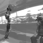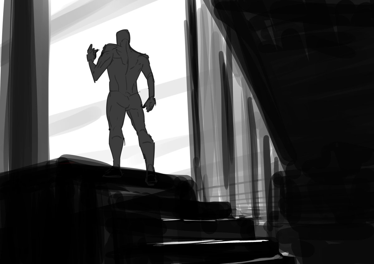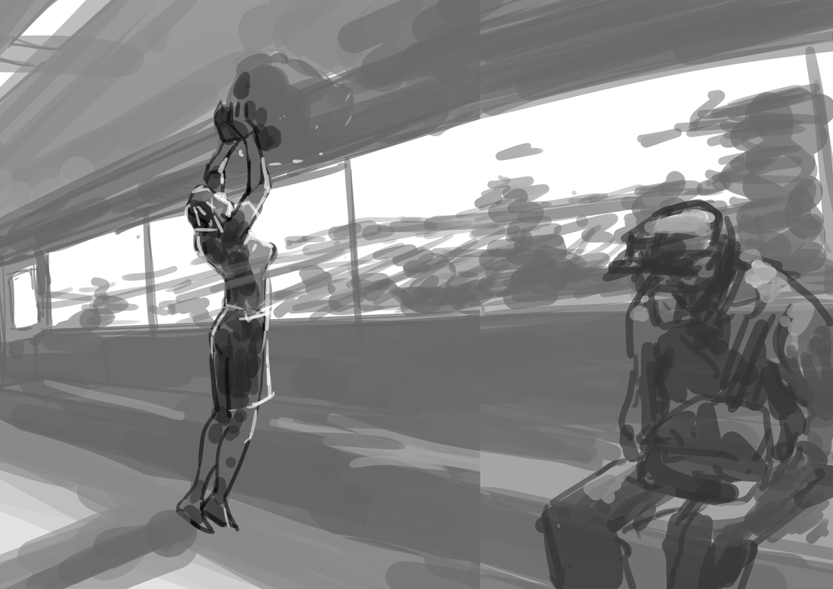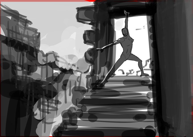 ポーズマニアックスで描いたポーズを生かす構図の絵を考えながらラフを描きました キャラクターにはパースがあるのでそれをもとに周りの風景を推理していくような感覚 おもしろい youtube.com/live/w37cQldaV…