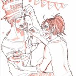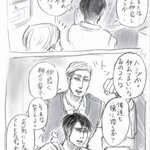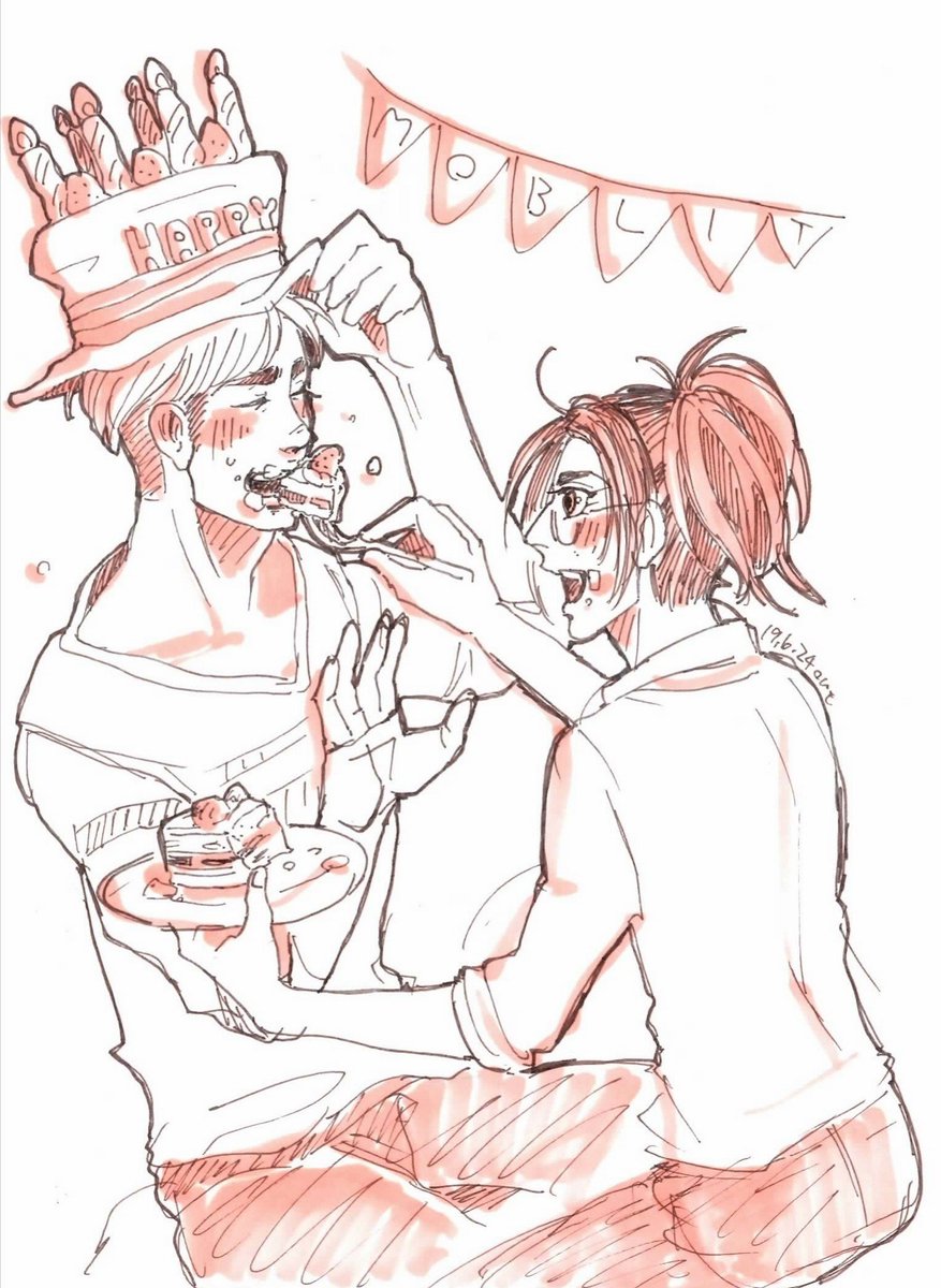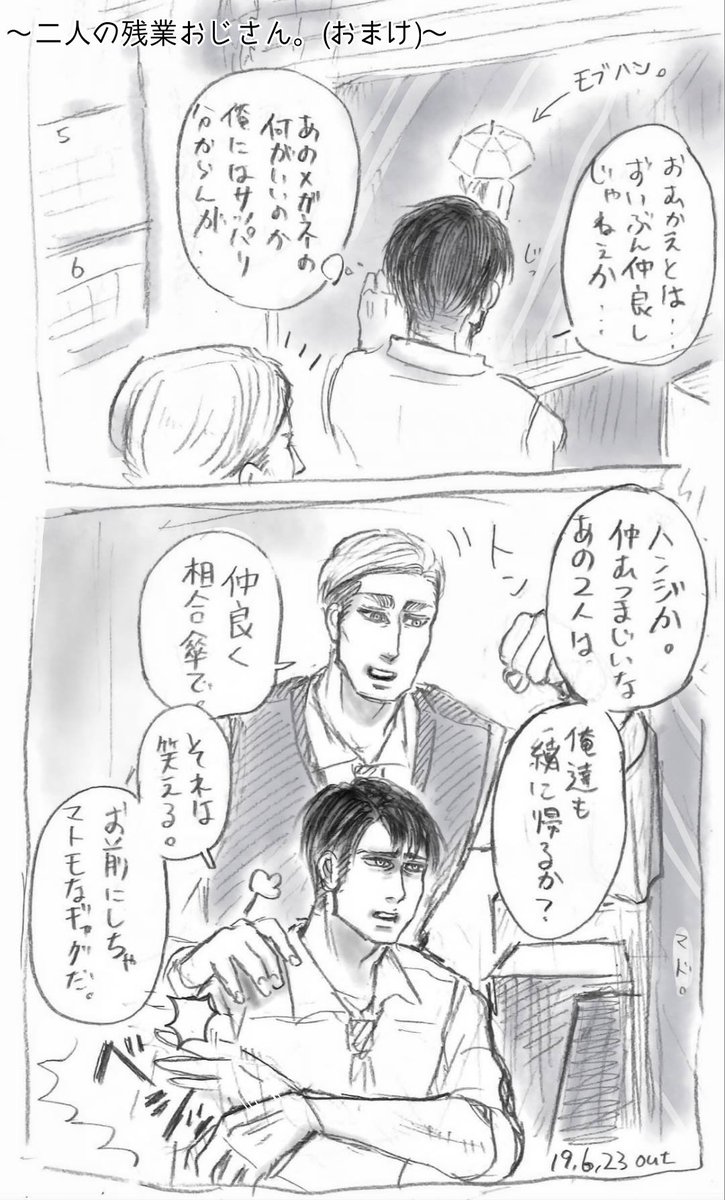 25 120 【モブリット超誕生日おめでとう(2/2)】 +オマケの落書き。 モブハンを眺める二人のおじさん&めいっぱい祝われたモブリットくん🎂 19/06/24 22:36