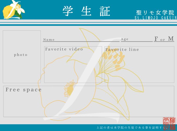 上げ直し😭 聖リモ女学院学生証(自己紹介テンプレ)発行しました。フリースペースデカすぎ感が否めないけど🙄 エセ校章はポピーとレモンの花です🍋 使用許可不要なのでどしどし使ってリモ女さんと仲良くなりましょ〜! ポピーーーー‼︎‼︎ #聖リモ女学院 #リモ女さんと繋がりたい #リモー絵先生