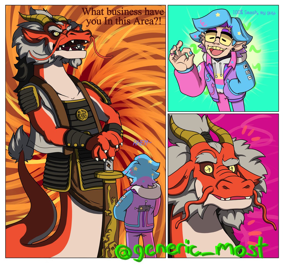 A very brief comic of a funny little memory from one of @starheavenly 's streams. He said he'd Smash my Dragonborn here, Wushi Zhu Long. #digitalart #originalcharacter #FANART #artwork #dragons