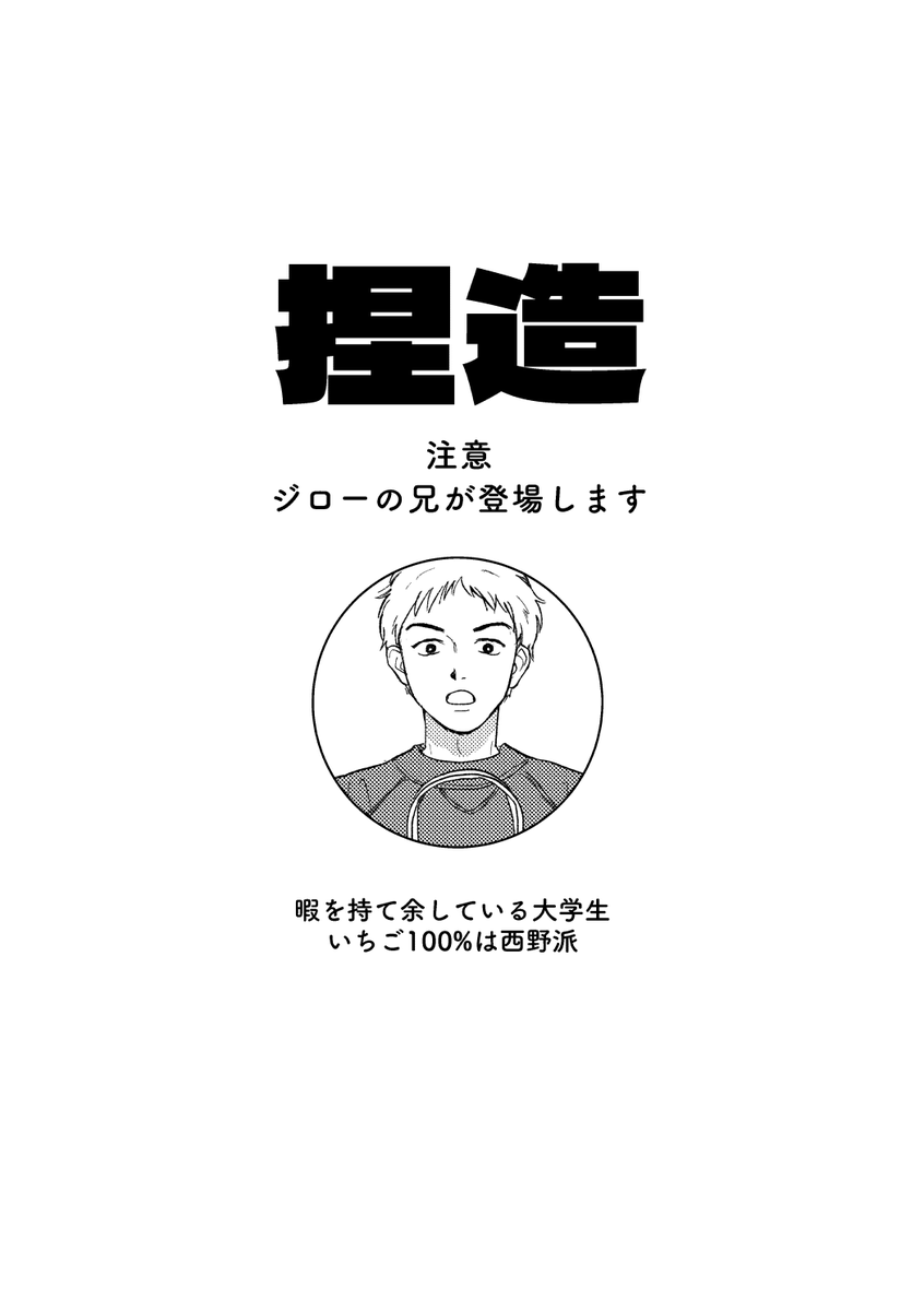 44 208 【5/4 全国大会GSΩ 新刊サンプル】 跡ジロ/A5/全年齢/表紙込22p/300円 ⚠️捏造ジロー兄が出ます 跡ジロ+ジロー兄のやまなしおちなしのゆるいまんがです。 お品書きはまた後ほどあげます! 23/05/01 12:08