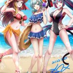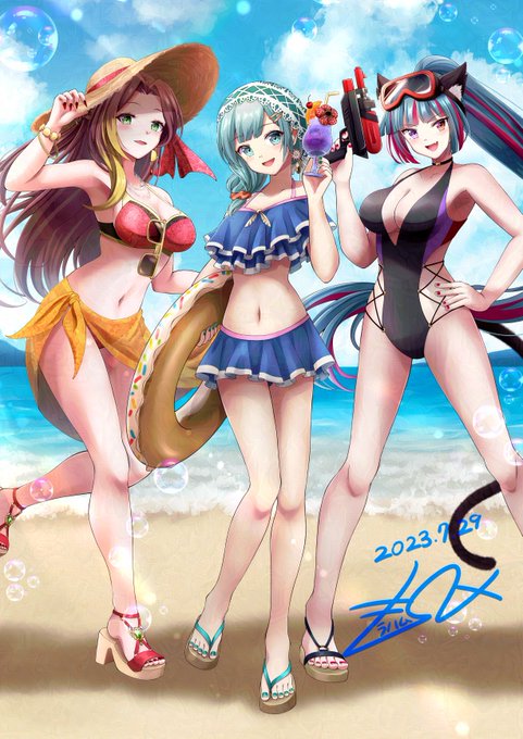 改めて、クローロさん(@kuroro_iriam)、メアリー・フェールさん(@MaryFer_0218)、木吟アオギリさん(@kogin_aogiri)の水着イラストを描かせていただきました!!✨ こちらのイラストを使用したグッズもSUZURIで販売中なので、是非お迎えしてくださいな!🐿️ suzuri.jp/kurawro