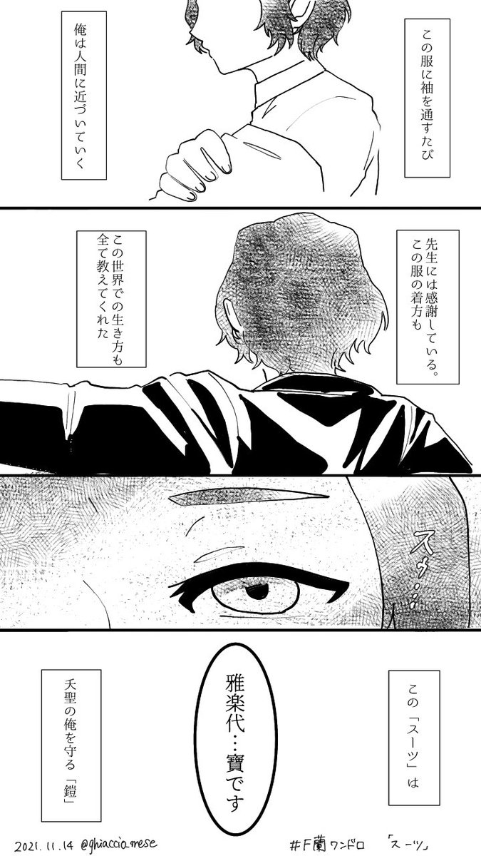 6 36 #F蘭ワンドロ お題「スーツ」 しょたからさん、きっと最初はスーツの着方も分からなかったと思うんだ……でもどんどん手慣れていって「人間界に染まっていく」ことを感じてたんじゃないかなぁ…などと切ないことを考えました。 21/11/14 22:46