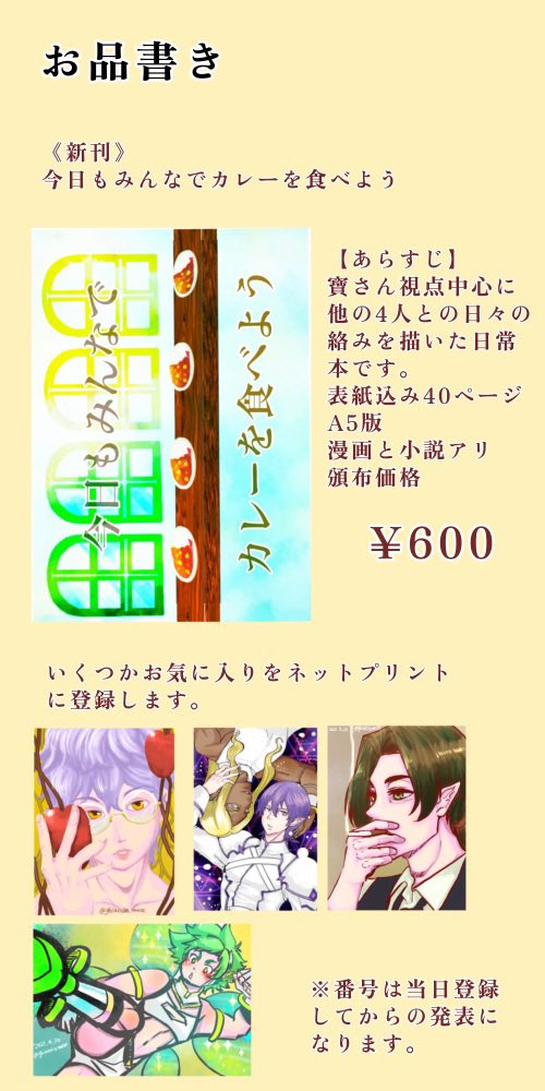 5 10 #夭聖garden お品書きです。 ネットプリント可能期間が登録した日から、という仕様なので、日付変わったあたりにTwitterで公開します。 過去に私が #F蘭ワンドロ に出したものであればイベント当日中は出来る限りネットプリントに登録しますので、スペース内書き込みボードにお気軽にご相談ください☺️ 22/12/10 08:08