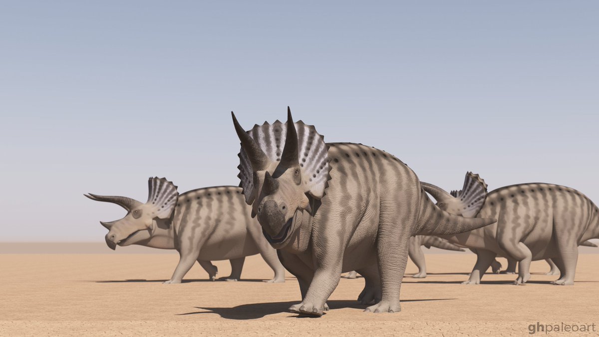 First experiment with atmospherics (probably exaggerated, as always happens when you begin testing something). Trini the #triceratops with her siblings. #paleoart #dinosaurs
