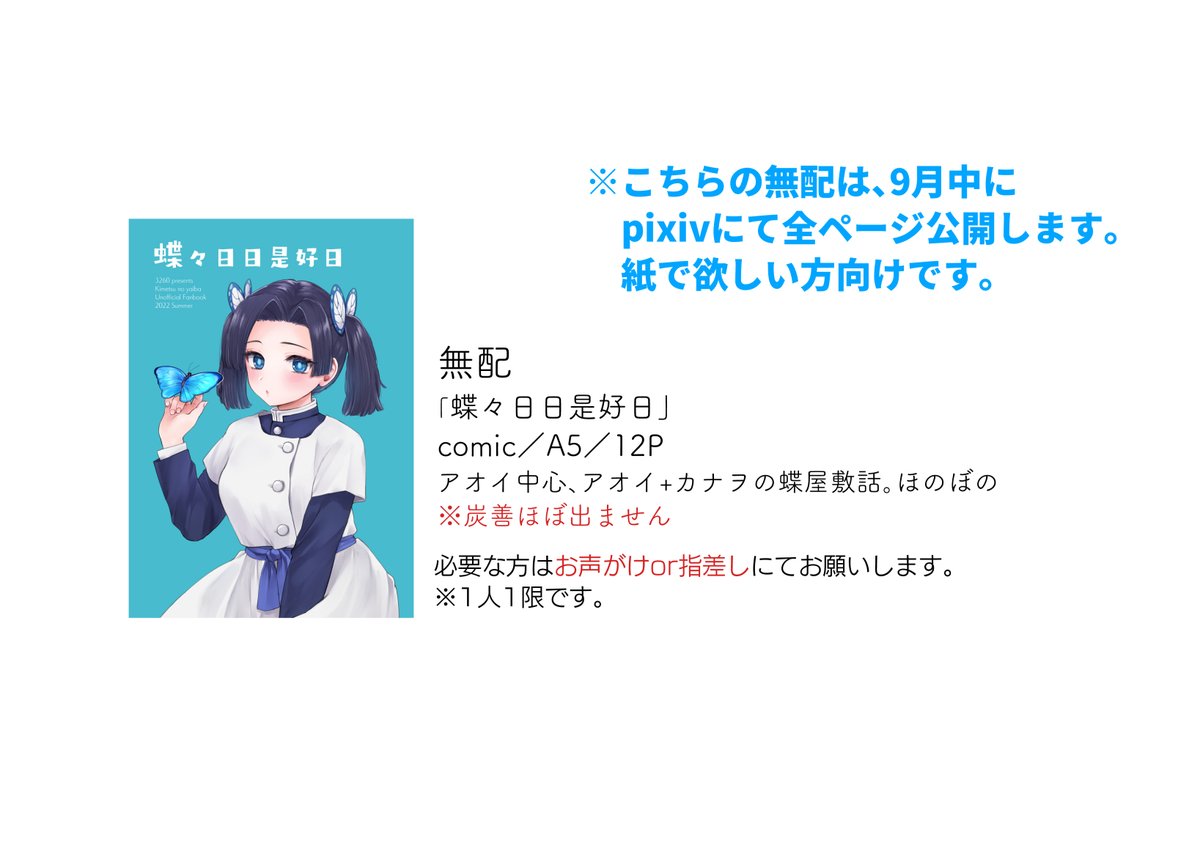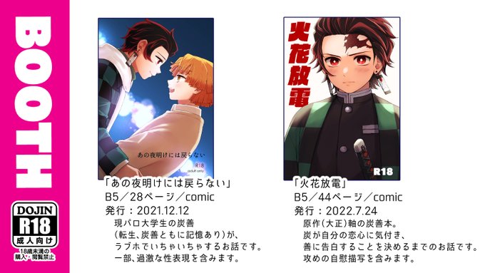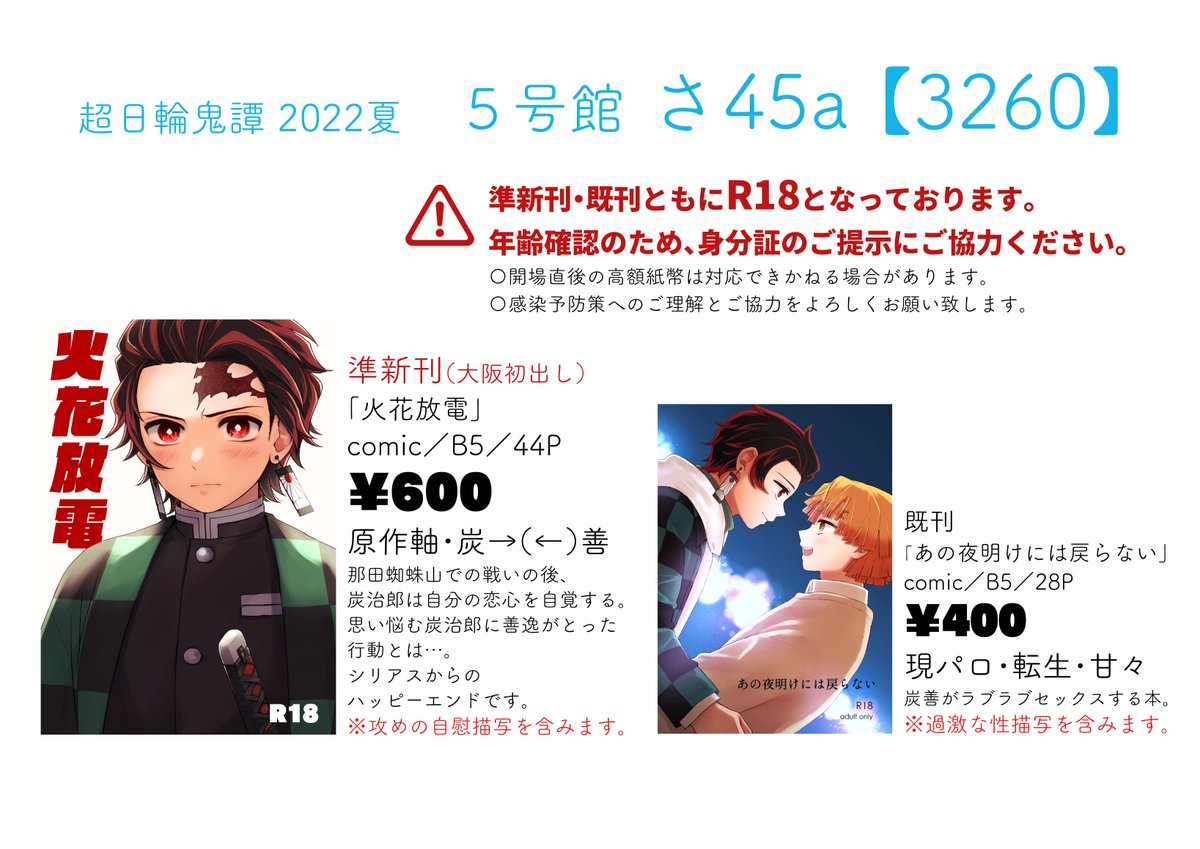 【8/21 お品書き(炭善)】 5号館 さ45a「3260」でお待ちしております。 大阪初出しの準新刊と無配があります! 準新刊(火花~)サンプル pixiv.net/artworks/99840… 既刊(あの夜明け~)サンプル pixiv.net/artworks/94780…
