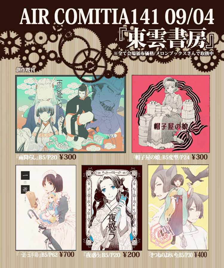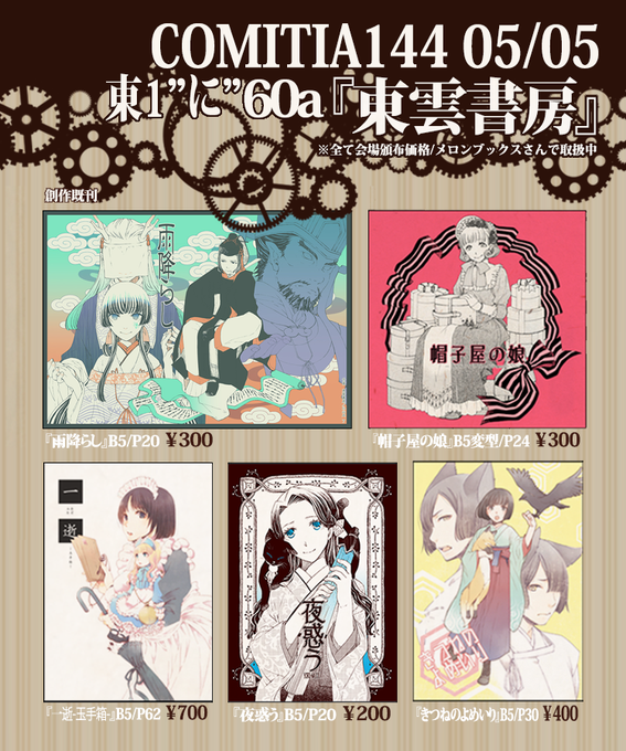 5/5 #COMITIA144 東1"に"60a『東雲書房』 おしながきはコチラになります。全て読切漫画です。新刊は無理っぽいのでペーパーが出来たら貰いに来て頂けると嬉しいです。 通販🍈→[melonbooks.co.jp/circle/index.p…] #COMITIA