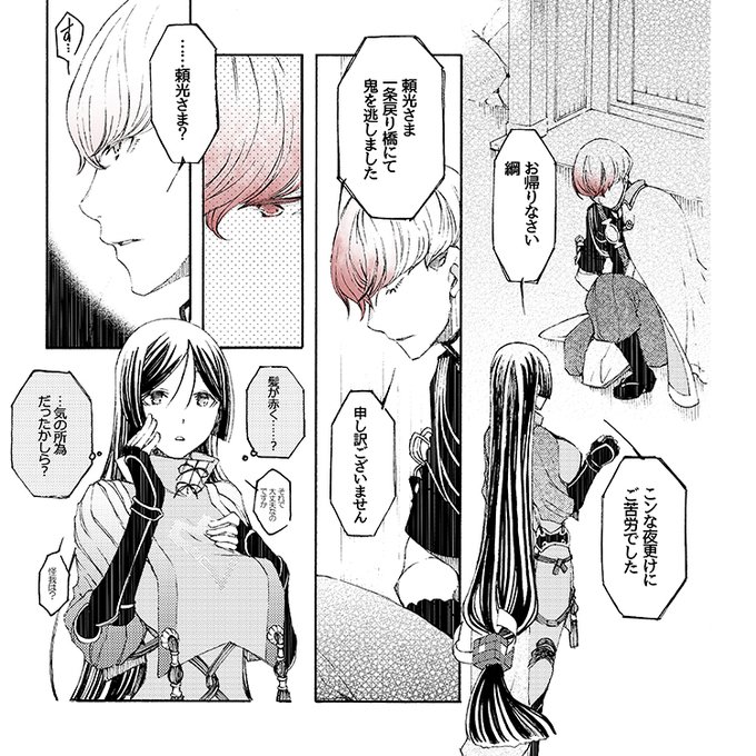 #C100 #C100新刊 予約開始しました 綱[と金時と茨木+頼光さん]の第三再臨に纏わる短編2本+αです 本文全頁2色刷/ノベルティ[ボールチェーン缶バッジ]付 フロマ→ melonbooks.co.jp/fromagee/detai… メロン→ melonbooks.co.jp/detail/detail.…