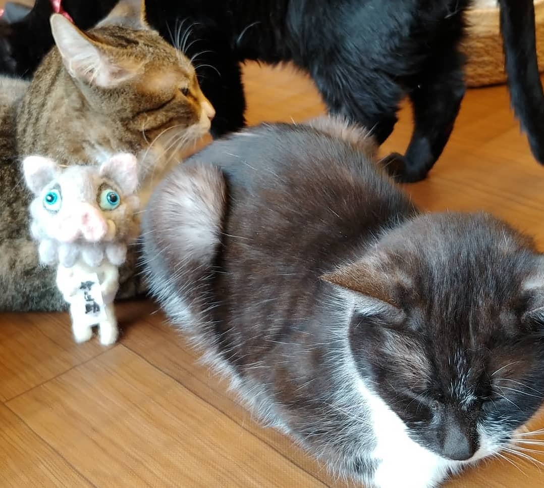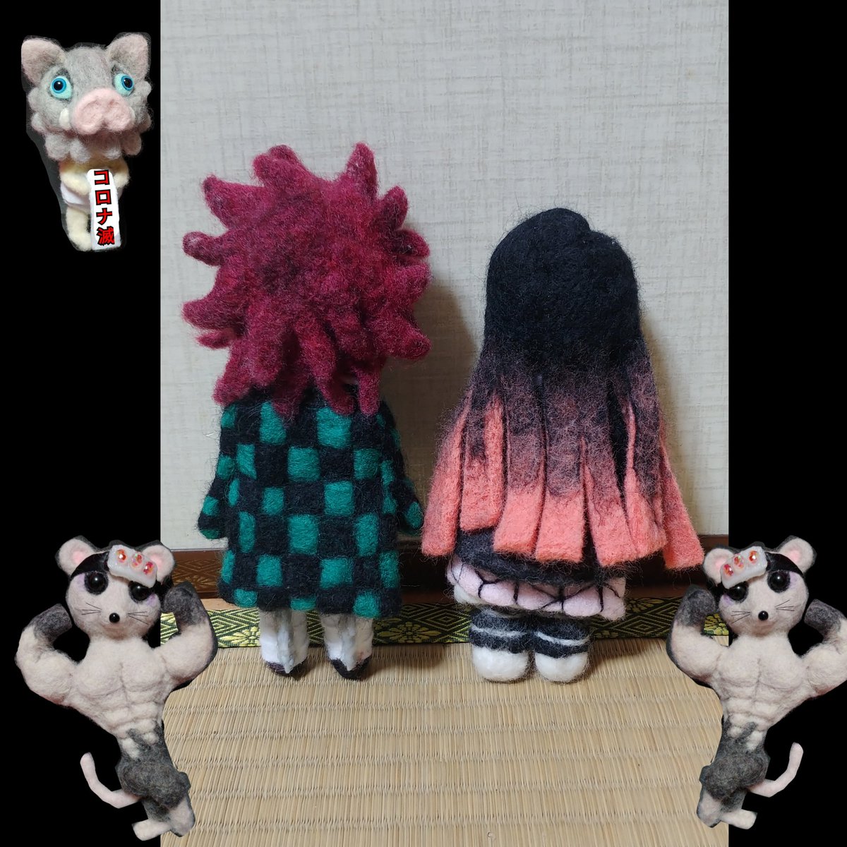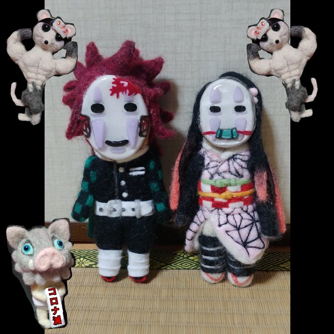 #家にいよう🏠 🧎♀#おうち時間 🏠🐾#stayhome🏠🧎♀ 🖤⚔鬼滅の刃+カオナシ👹🖤 #handmade #手作り #kaonasi #studioghibli #羊毛フェルト #needlefelting #鬼滅の刃 #demonslayer #kimetsunoyaiba #竃門炭治郎 #竃門禰豆子 *「禰」は「ネ+爾」** #嘴平伊之助 #ムキムキねずみ